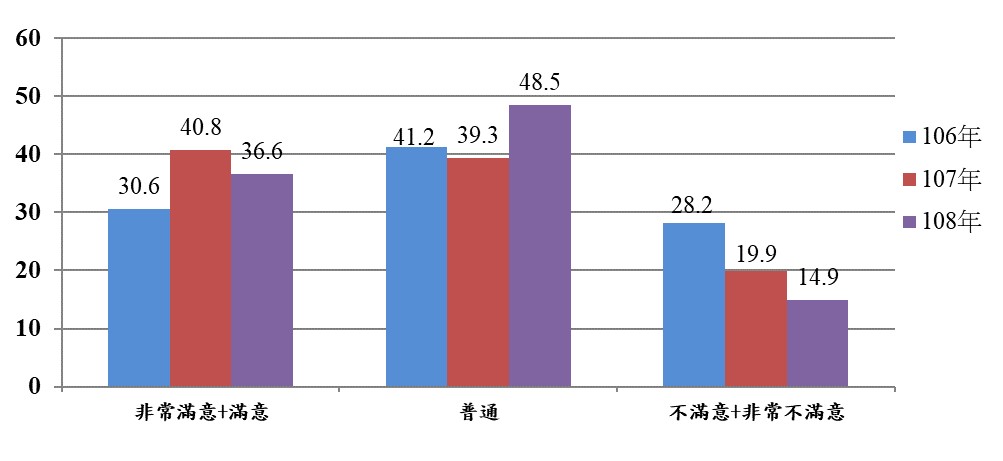 民眾對全民健保的高滿意度,醫護人員的共同努力功不可沒,健保署李伯璋署長表示,在健保永續理念下,將持續瞭解醫界對於健保政策實施的看法,作為未來溝通及施政的依據。臺大董鈺琪副教授對醫師滿意度進行調查,採不記名方式,邀請受訪醫師上網填答問卷。結果發現西醫師對健保滿意度從106年17.3%上升到108年33.7%,牙醫師從106年30.6%上升到108年36.6%,不滿意度均有下降趨勢,顯示醫界對於健保的態度有穩定正向發展的趨勢(圖2)。