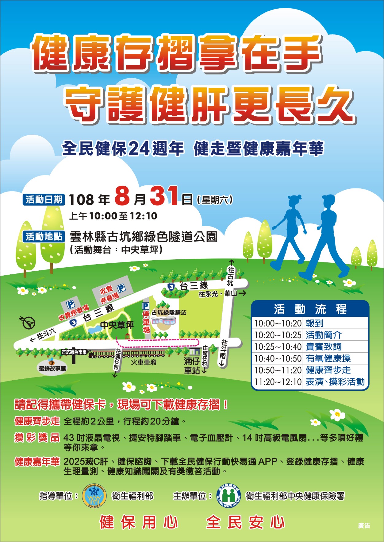 歡慶健保24週年,衛生福利部中央健康保險署於108年8月31日(星期六)上午10時在雲林縣古坑鄉綠色隧道公園舉辦「健康存摺拿在手 守護健肝更長久」健走暨健康嘉年華活動,不需事先報名,當日只要完成健走即可參加摸彩,有43吋液晶電視、捷安特腳踏車、電子血壓計及高級電風扇等多項豐富獎品等您來拿!