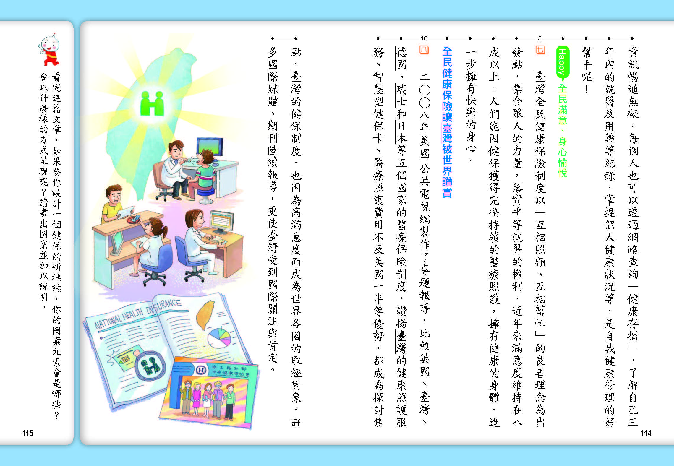 此外,由兒童文學作家桂文亞所撰寫的「健康生活最幸福」、健保署企劃組副組長王復中撰寫的「隱形的驕傲」、吳佳璇醫師撰寫的「蘭嶼守護天使」,以及張耀懋副教授撰寫的「同學說」等四篇文章,則同時編入翰林版的教師手冊,可作為教師上課的延伸教材,使學生得以加深加廣對健保常識及資訊的學習。