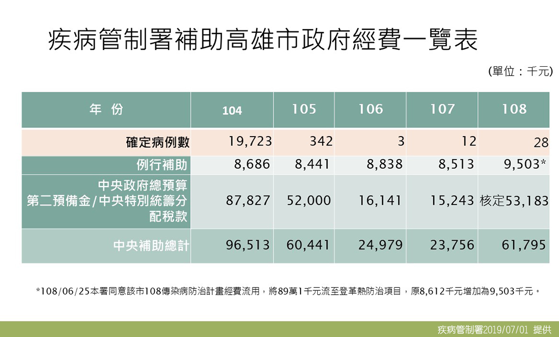 ▲ 疾管署補助高雄市政府防治經費一覽表(疾管署提供)