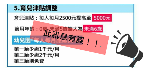 近日媒體報導育兒津貼將自110年元旦起每人每月調高為5,000元,衛生福利部表示該訊息有誤,請民眾勿再轉傳。 為落實總統提出「0到6歲國家一起養」於4年內育兒津貼再加碼(每人每月2,500元倍增到5,000元)政見,行政院刻正積極邀集相關部會通盤檢討我國少子女化對策計畫,並就政策具體內容、執行細部規劃與財源籌措等議題進行跨部會協調,俟該計畫修正完成,將由行政院統一對外說明,屆時衛生福利部及教育部也將製作懶人包及相關宣導單張等加強宣導。