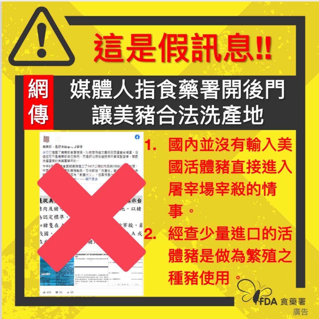 有關媒體報導,食藥署大開後門讓美豬合法洗產地,美國進口活體豬在臺灣宰殺後就變臺灣豬乙節,食藥署澄清,國內並沒有輸入美國活體豬直接進入屠宰場宰殺的情事,經查少量進口的活體豬是做為繁殖之種豬使用。