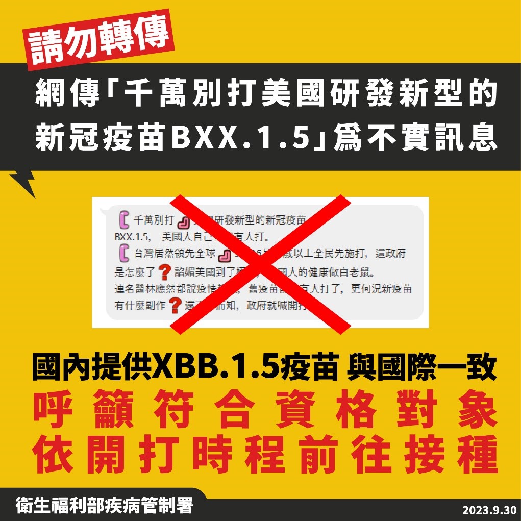 有關近日網傳「千萬別打美國研發新型的新冠疫苗BXX.1.5」之COVID-19疫苗不實訊息,疾病管制署(下稱疾管署)今(30)日嚴正澄清,國內提供之COVID-19疫苗為XBB.1.5,非網傳之BXX.1.5,XBB.1.5疫苗係經衛生福利部食品藥物管理署核准莫德納專案輸入,目前國內外COVID-19疫情持續且以 XBB為主流病毒株,考量國內本土併發症中65歲以上民眾佔7成以上,為降低感染COVID-19後併發重症和死亡風險,於今(2023)年9月26日優先開放65歲以上民眾接種。