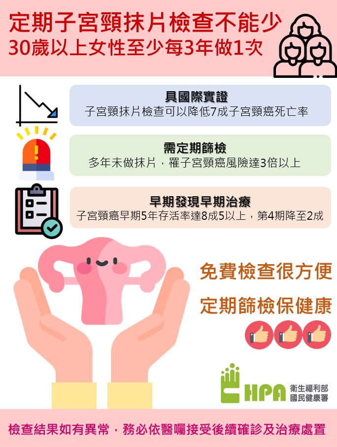 經國際實證顯示,定期子宮頸抹片檢查可以早期發現子宮頸癌前病變及早期子宮頸癌,癌前病變經治療後,可阻斷疾病發展為子宮頸癌。國民健康署自84年起提供30歲以上女性子宮頸抹片檢查服務,推動至今,已使子宮頸癌標準化發生率(106年標準化發生率每十萬人7.9人)及死亡率(108年標準化死亡率每十萬人3.2人)皆下降約7成左右。然而,每年仍有約1,400人診斷為子宮頸癌,發生年齡中位數為58歲,有近700人死於子宮頸癌,子宮頸癌對婦女朋友的威脅仍然不可以輕忽,國民健康署呼籲民眾定期檢查以早期揪出癌前病變。