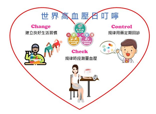世界高血壓聯盟將2020年世界高血壓日主題訂為「Measure Your Blood Pressure, Control It, Live Longer」,呼籲各國政府重視測量血壓的重要性。,因為高血壓是心血管疾病、腦中風、糖尿病、腎臟病等重大慢性病的共同危險因子。依據108年衛生福利部死因統計資料顯示,國人因高血壓導致的心血管疾病死因,例如心臟疾病、腦血管疾病及高血壓性疾病等,分別列在十大死因第2位、第4位及第8位,共造成38,290人死亡,即每4.5個死亡人數中就有1人是死於高血壓直接相關的三種死因。顯見不管是高血壓本身,或是其後續衍生的心臟病及中風等問題都對國人健康造成嚴重威脅。
