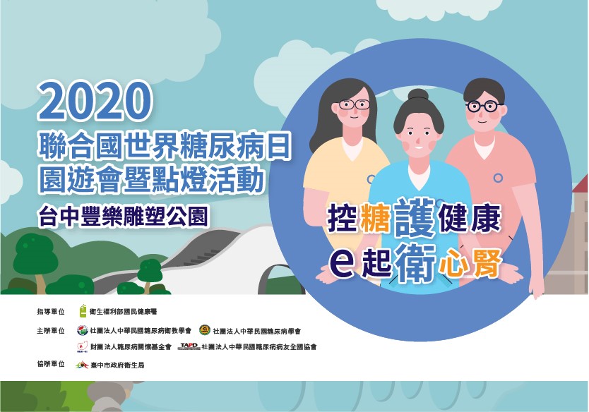 為響應2020聯合國世界糖尿病日,國民健康署與社團法人中華民國糖尿病衛教學會、社團法人中華民國糖尿病學會、財團法人糖尿病關懷基金會、社團法人中華民國糖尿病病友全國協會、臺中市政府衛生局等中央與地方單位攜手合作,共同辦理「2020聯合國世界糖尿病日 園遊會暨點燈活動」,11月7日下午將於臺中市豐樂雕塑公園盛大舉行,將首度公開「你和我」歌曲MV,展現醫護人員對糖友的陪伴與愛,國民健康署與相關學協會歡迎大家一起到現場以行動支持「控糖護健康,e起衛心腎」。