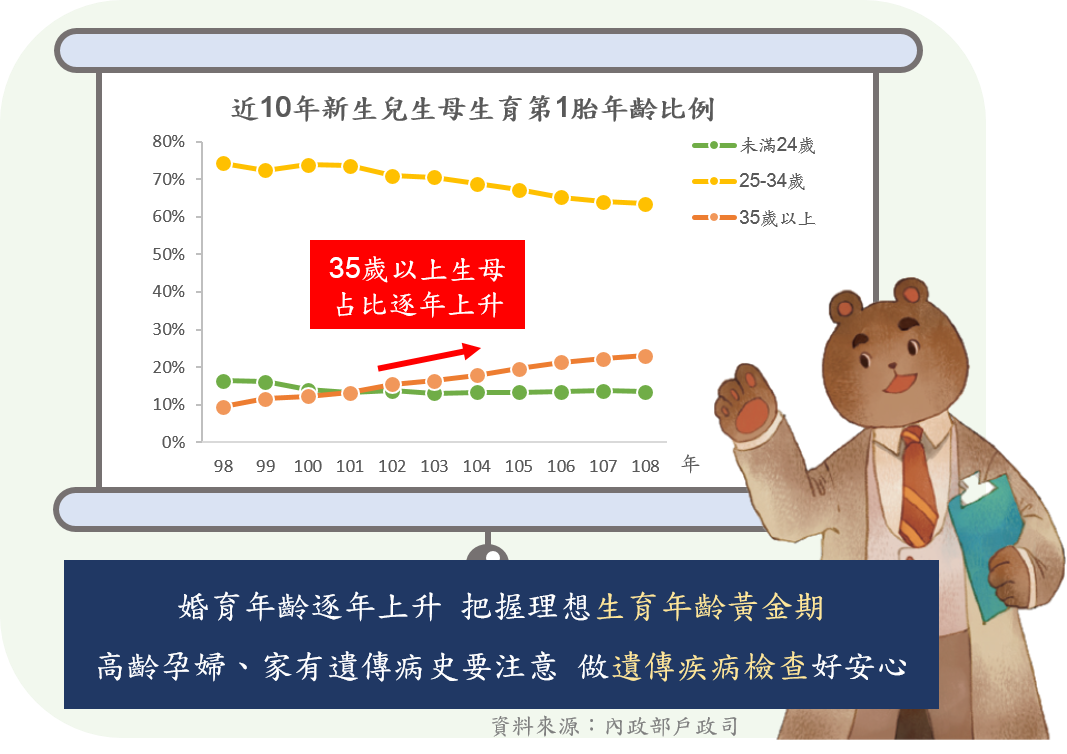 國人晚婚晚育現象日益普遍,依內政部108年人口統計資料顯示,國人平均初婚年齡,男性為32.6歲,女性30.4歲,而國內女性生育第1胎的平均年齡已至31歲,其中年齡為35歲以上者更達23%,是10年前的2.4倍(98年為9.4%),顯示出國內婚育年齡往後延遲的趨勢。國民健康署提醒年輕男女,及早進行婚育規劃。
