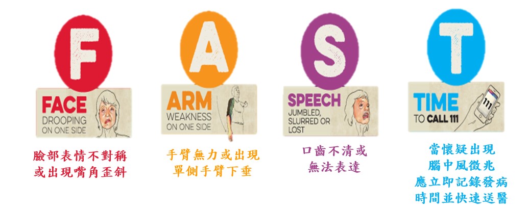 心血管疾病之急性發作如心肌梗塞及腦中風是危及生命之緊急狀況,心臟學會黃瑞仁理事長表示,儘早就醫可減少死亡及病後殘留失能之嚴重度,增加復原機會。如果出現胸悶、胸痛、手臂疼痛、呼吸困難、噁心、極度疲倦、頭暈等,另更年期女性可能出現氣喘、背痛等非典型症狀,很有可能是心臟病急性發作。記住中風症狀FAST口訣:臉部(Face)表情不對稱、雙手(Arm)力氣不一樣、或講話(Speech)變得不清楚,有任一症狀,記下時間點(Time)快快就醫。