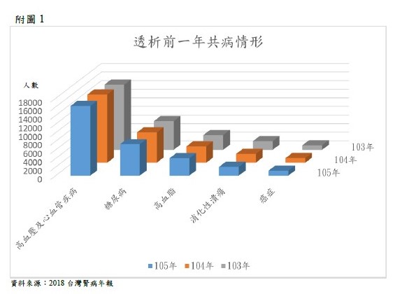 你知道三高(高血壓、高血糖、高血脂)是造成慢性腎臟病的主要原因嗎?洗腎病人在透析前1年罹患的疾病中,前3名就是三高(附圖1),其中患有糖尿病者更占了4成7。另根據106年國民健康訪問調查(NHIS)結果,對於三高的防治有7成以上民眾知道要注意及控制飲食和養成運動習慣,但僅有3至4成知曉須控制體重、戒菸、少飲酒及定期健康檢查,且僅有2成民眾知道要避免腰部肥胖,而肥胖及吸菸、飲酒,都是造成三高慢性病最主要的原因之一,顯示國人對於慢性病防治的知識仍須加強。國民健康署王英偉署長提醒,預防「腎」於治療,全民都應重視三高的預防與控制,就能遠離腎臟病的威脅!
