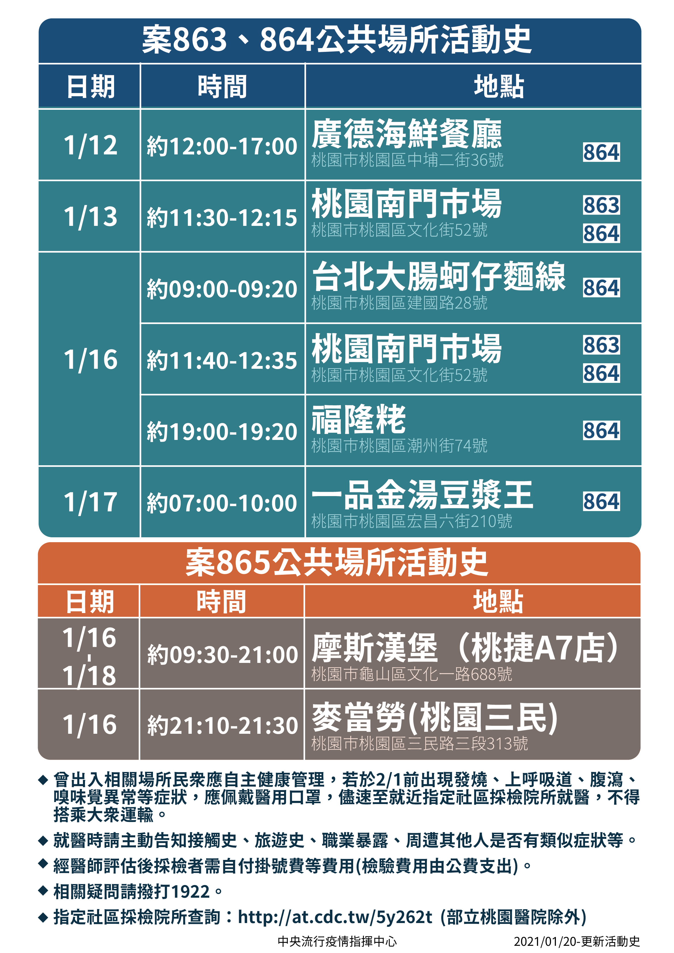 另針對案863、864及865家庭群聚,指揮中心今日再公布個案之其他公共場所活動史(如附件),提醒曾於附件所列時段出入相關場所的民眾,請自主健康管理,2月1日前如出現疑似症狀,應確實佩戴醫用口罩,就近至指定社區採檢院所就醫,且不得搭乘大眾交通運輸工具;就醫時請主動告知接觸史、旅遊史、職業暴露及身邊是否有其他人有類似症狀,經醫師評估後採檢者需自付掛號費等費用(檢驗費用由公費支出);返家後亦應佩戴口罩避免外出,與他人交談時應保持1公尺以上距離。