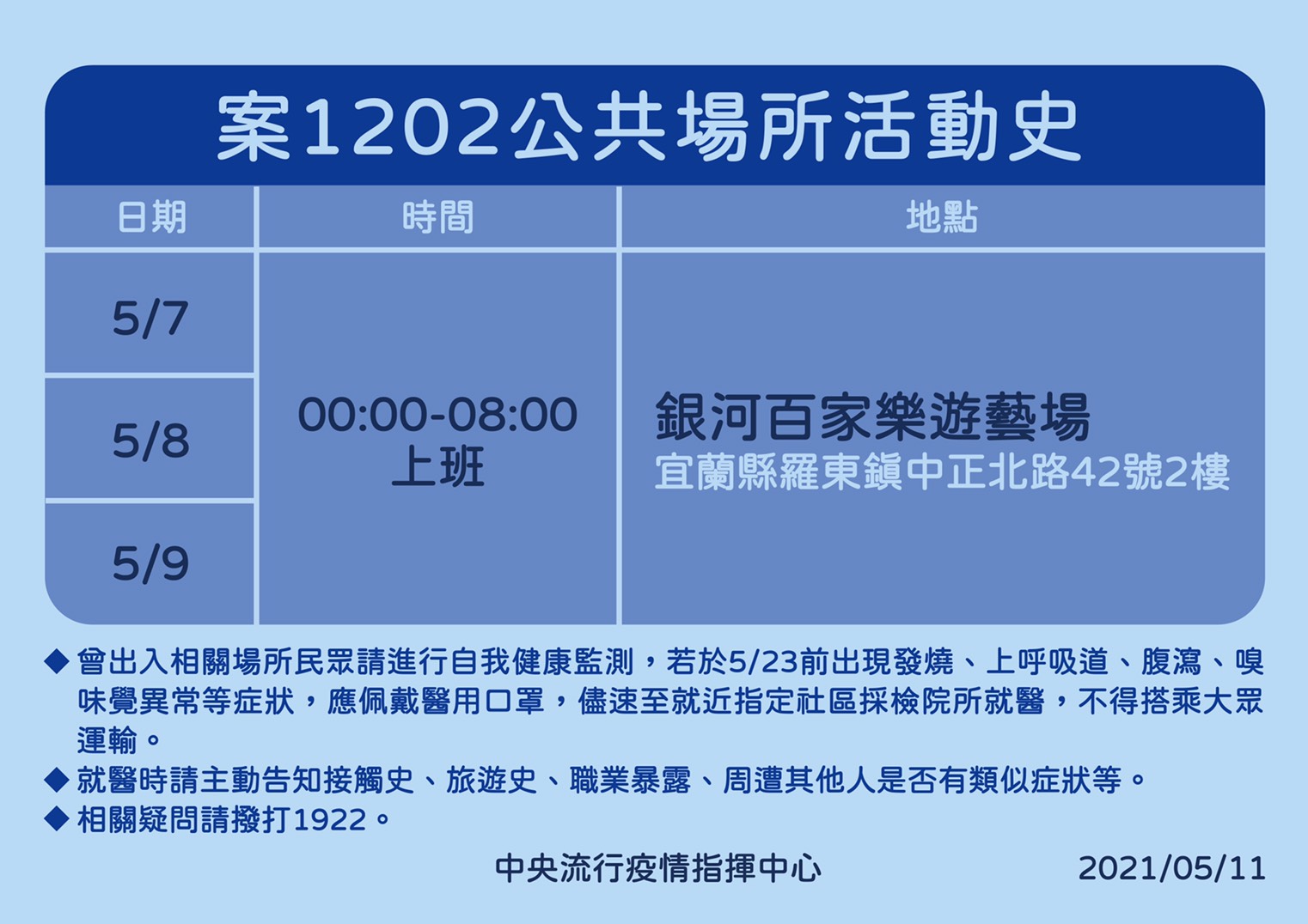 指揮中心指出,案1202為本國籍30多歲女性,於宜蘭縣羅東鎮中正北路之「銀河百家樂」遊藝場工作。個案5月9日出現發冷、全身無力、咳嗽、發燒等症狀,至醫院就醫及採檢,於今日確診(Ct值20)。鑒於個案工作地為室內密閉擁擠場所,且顧客停留時間較長,傳播風險較高,衛生單位接獲通報後,隨即將個案同住家人、同事及常客等35人列為居家隔離對象並進行採檢,截至目前4人核酸檢測陽性確診(案1208至案1211),17人陰性,10人檢驗中。衛生單位將持續針對近期出入該遊藝場之人員調查匡列。