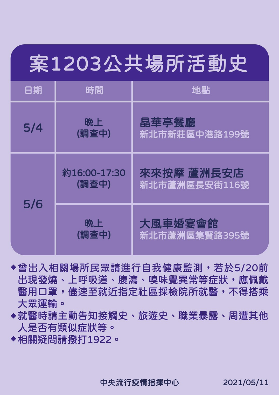 指揮中心表示,案1203為本國籍60多歲男性,近期無出國史,5月7日出現疲倦、咳嗽、畏寒等情形,5月9日因發燒至醫院就醫採檢,於今日確診(Ct值18);感染源待釐清。已初步掌握個案接觸者115人,列居家隔離,其他接觸者持續調查匡列中。