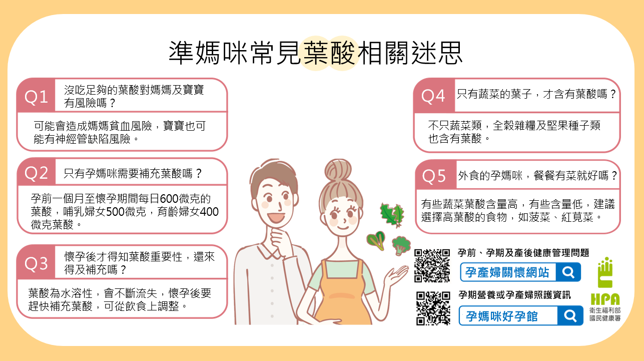 為破除孕前或懷孕期葉酸攝取的迷思,國民健康署彙整準媽咪常見的5大問題: