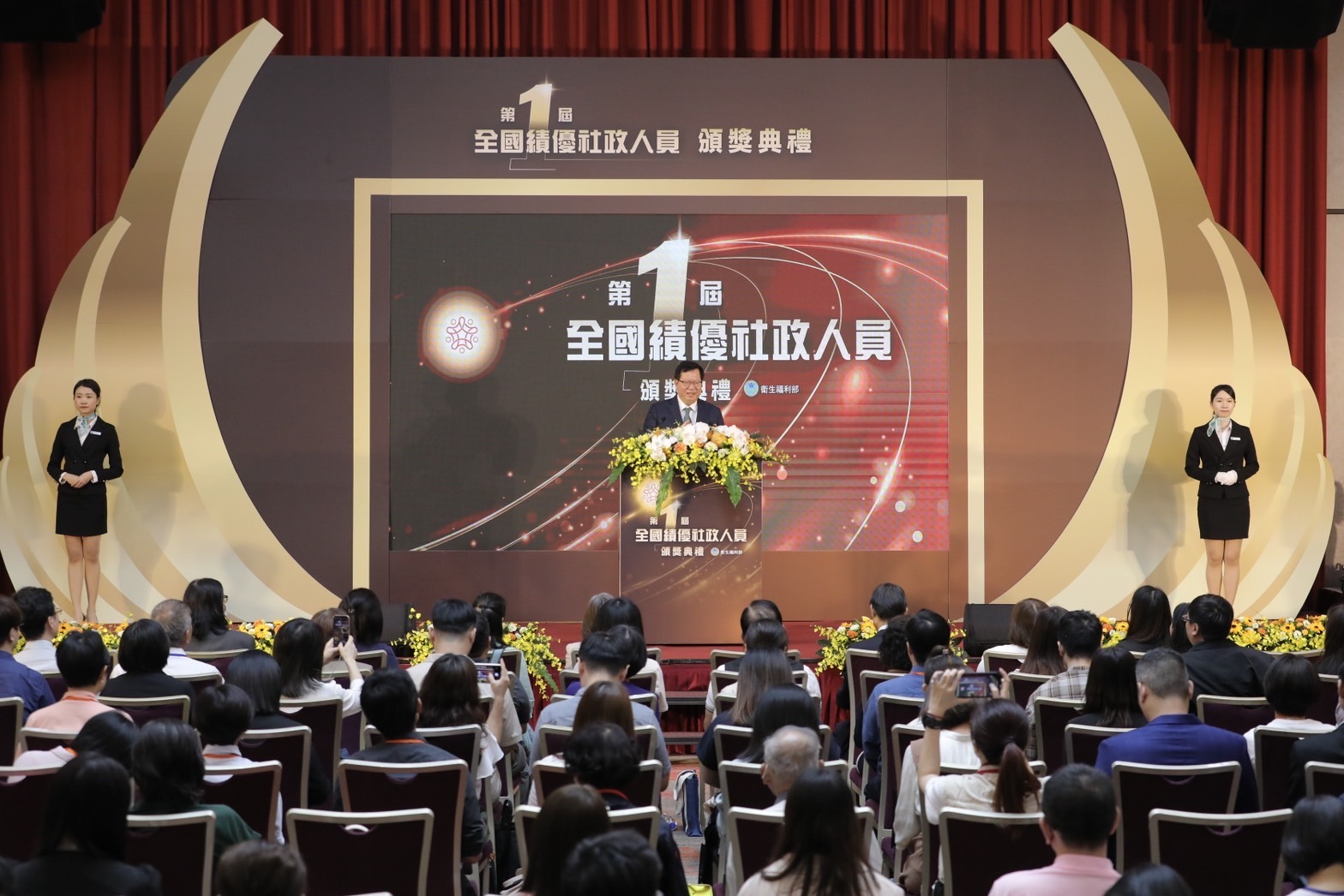 衛生福利部為感謝社政人員辛勞與無私奉獻,並激勵士氣與熱忱,於今(15)日下午2時假臺大醫院國際會議中心201廳舉行第一屆全國績優社政人員頒獎典禮。行政院副院長鄭文燦特別親自蒞臨頒獎,感謝社政人員在全國各個角落之付出與關懷,接住每一個有需要協助的民眾及家庭,讓臺灣更加美好。本(第1)屆計94位社政人員報名角逐,由衛生福利部邀請專家學者與社會賢達組成評審小組,最終選出50位績優社政人員接受表揚,其中包括「資深敬業服務獎」和「服務績優獎」各10位和40位得獎者。