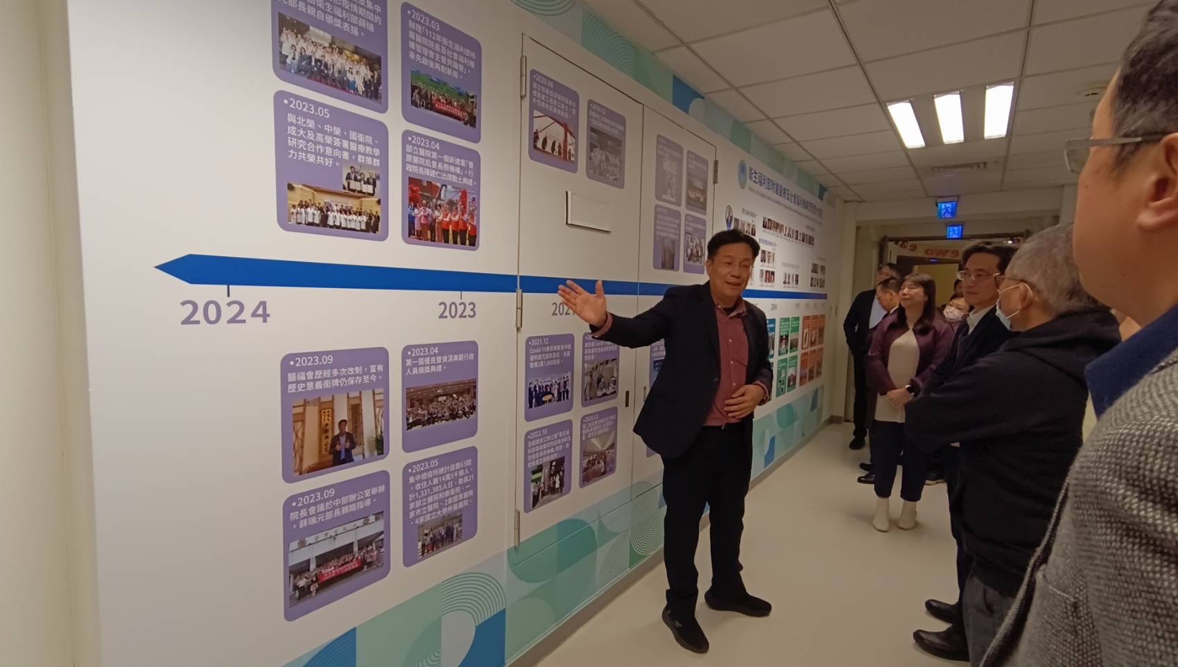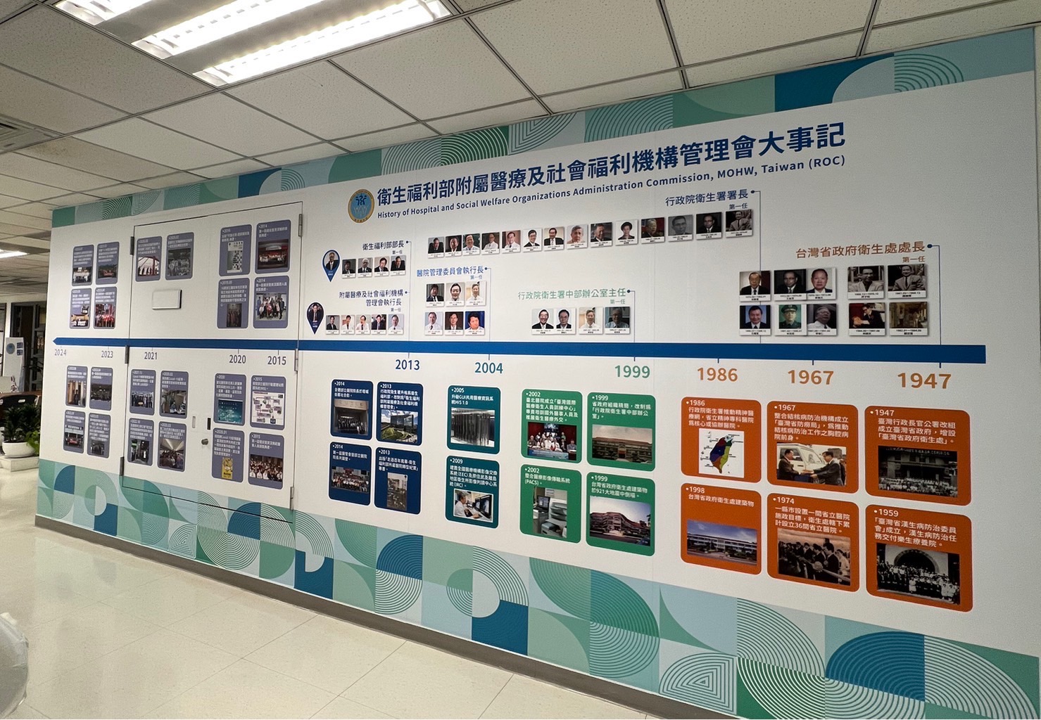 衛生福利部附屬醫療及社會福利機構管理會於113年1月26日下午舉行歷史走廊揭幕儀式,由執行長林慶豐,與衛生福利部主任秘書張雍敏及26家部立醫院院長一同回顧自1947年臺灣省政府衛生處設立以來,歷經精省、行政院衛生署組織再造等多次改制的歷史軌跡,及部立醫院肩負公醫使命,配合國家衛生保健政策,推動各項公共政策紀實等照片。
