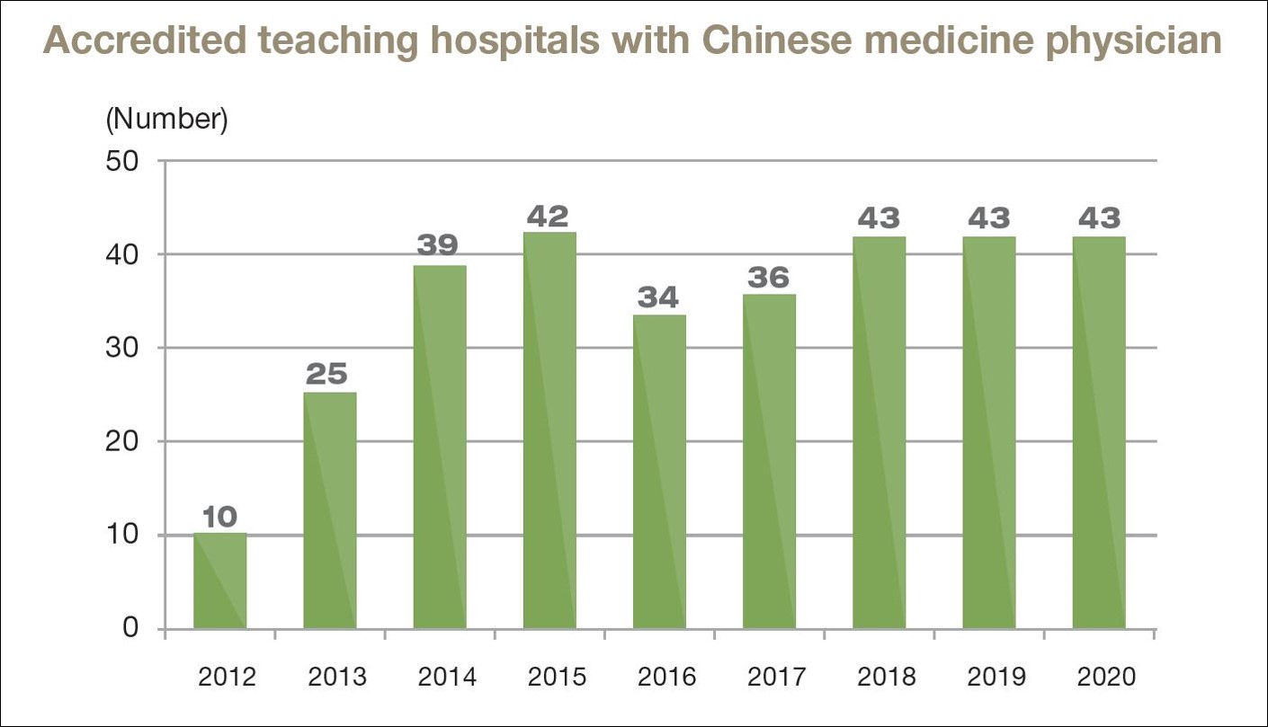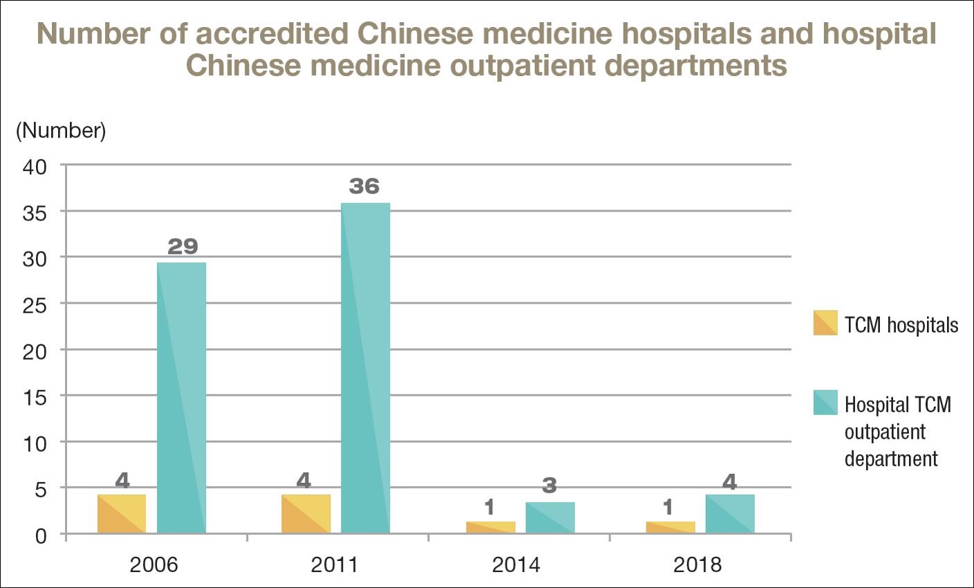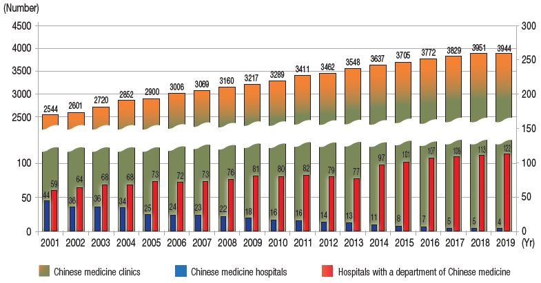 The Ministry encourages general hospitals to set up departments of Chinese medicine in order to provide both Western medicine and Chinese medicine in parallel toward better public health care and prevention. Also, setting up a department of Chinese medicine will promote the integrated development of Western medicine and Chinese medicine. The number of Chinese medicine institutions has been gradually growing over the past ten years. As of the end of 2019, there are a total of 4,070 Chinese medicine institutions in Taiwan, including 4 Chinese medicine hospitals, 3,944 Chinese medicine clinics and 122 hospitals with a department of Chinese medicine.