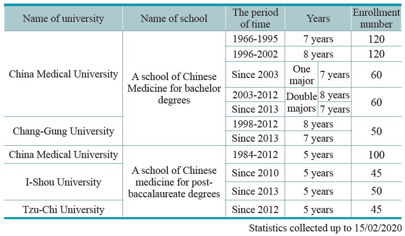 China Medical University established the School of Chinese Medicine in 1966. Since then, Taiwan has had 5 schools of Chinese medicine at 4 universities: schools of Chinese Medicine for bachelor degrees at China Medical University and Chang-Gung University; and schools of Chinese Medicine for post-baccalaureate degrees at China Medical University, I-Shou University and Tzu-Chi University. Annually 365 modern Chinese medicine physicians are educated and trained to receive both western and Chinese medical knowledge. Table 2-1 roughly shows the duration of training and admission numbers for Chinese medicine education in each institution.