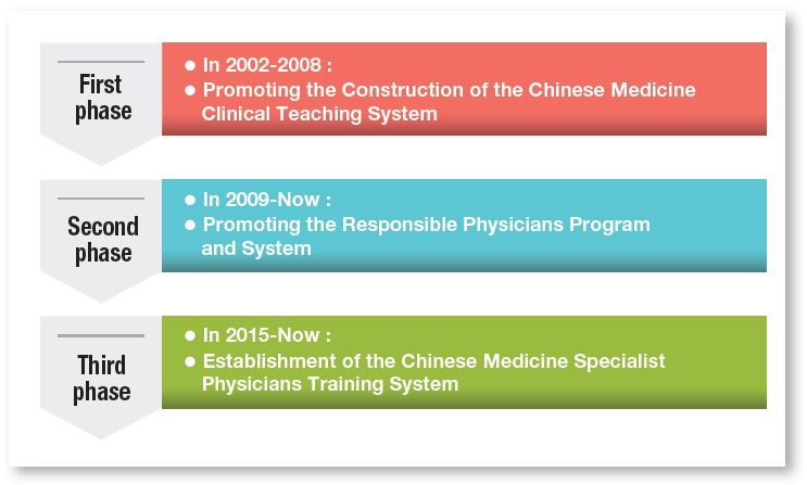 - The first phase: "Chinese Medicine Clinical Teaching System Plan" was promoted during 2002-2008. Training teachers, locating facilities, establishment of the training models, developing plans, compiling educational materials, implementing of training and other fundamental works were completed gradually, to enrich teaching institutions'software and hardware equipment and resources.