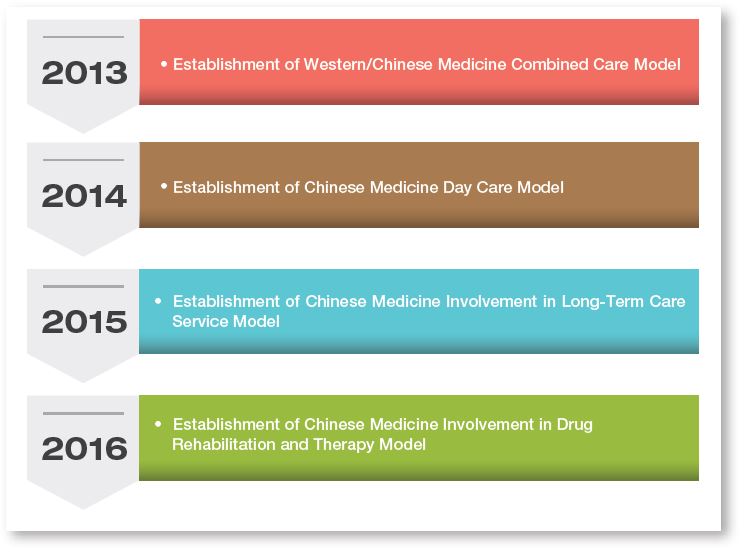 Chinese Medicine Involvement in Long-Term Care Service Model: This model has been established in 3 different settings (nursing homes, retirement homes, and home care centers).
