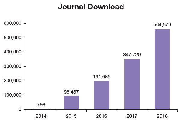 Since the first issue, the Journal has been published quarterly, with 4 issues per year. At least 10 articles are published in every issue, reviewed and edited by 47 expert reviewers from 19 countries. In 2015, in collaboration with Elsevier, JTCM became available on the Elsevier platform, and the number of article downloads increased considerably (Figure 4-6). JTCM was globally ranked 54th, 23rd, 11th, 9th, and 5th respectively, in 2015, 2016, 2017, 2018, and 2019 by Scimago Journal & Country Rank in the field of Complementary and Alternative Medicine, making it a Q1 (top 25%) journal. Efforts will be made to transform JTCM into an SCI international electronic academic journal of TCM.