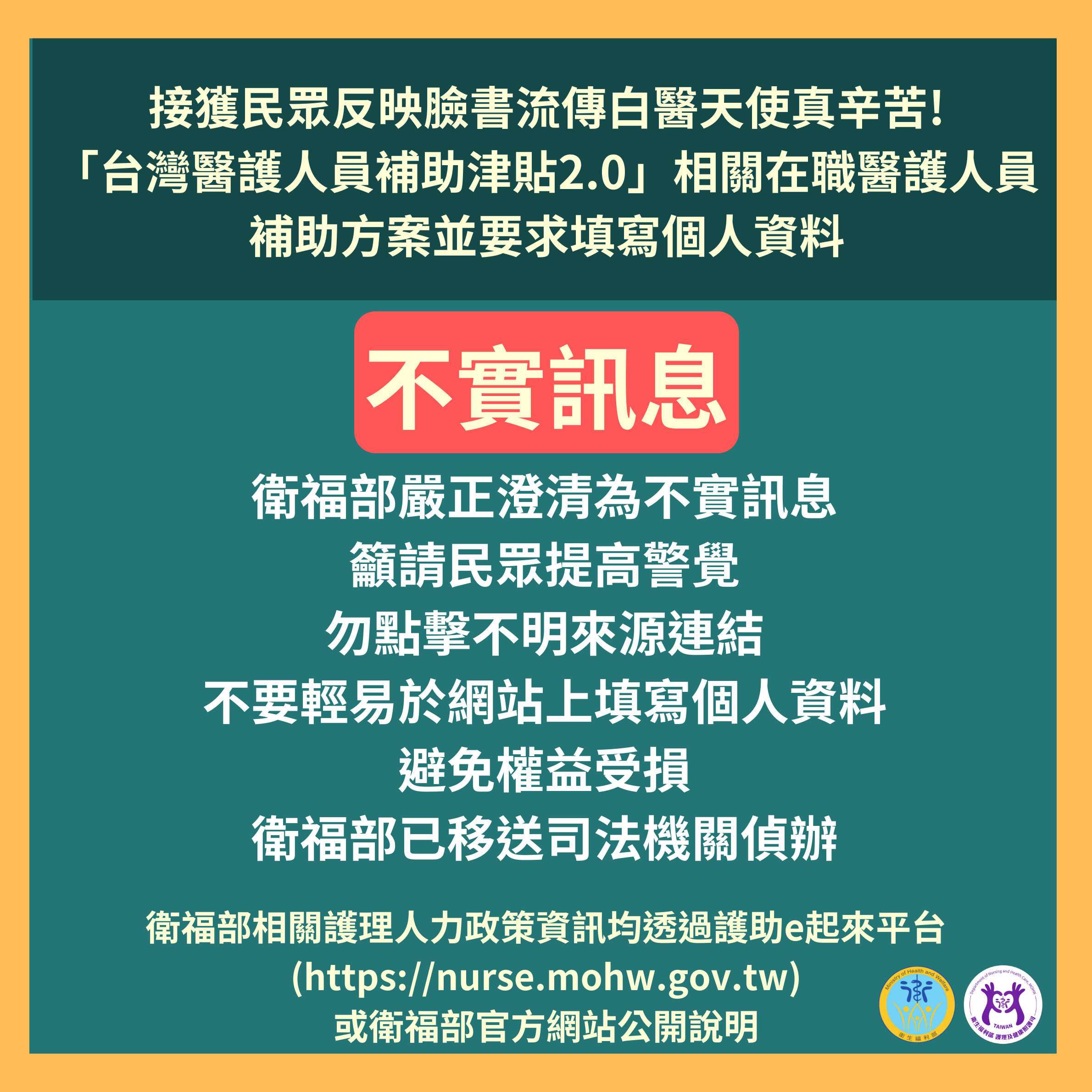 接獲民眾反映臉書流傳白醫天使真辛苦!「台灣醫護人員補助津貼2.0」相關在職醫護人員補助方案並要求填寫個人資料。衛福部嚴正澄清為不實訊息,籲請民眾提高警覺,勿點擊不明來源連結,不要輕易於網站上填寫個人資料,避免權益受損。衛福部已移送司法機關偵辦。