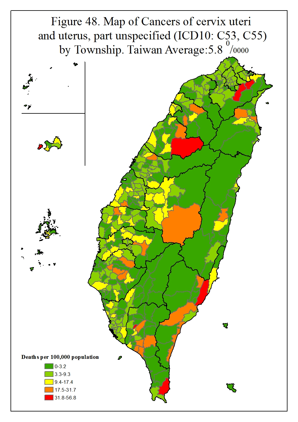 | Figure 48. Map of Cancers of cervix uteri and uterus, part unspecified (ICD10: C53, C55) by Township. | 2013-08-08 | 2013-08-08 | Figure 48 Cancers of cervix uteri and uterus, part unspecified_0030502000(.jpg File Download)(Open in a new window) | 1322 |